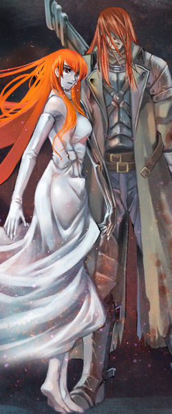 今回ほんの少し加筆したプロフ絵。主にシュエイの髪がほどけて、黒くなった左腕が覗くように。